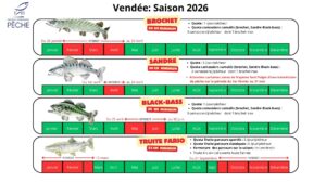 Dans le Département la Vendée, où tous les cours d’eau et plans d’eau sont classés en 2ème catégorie, la pêche en eau douce est autorisée durant les périodes d’ouverture fixées ainsi qu’il suit en 2026 :