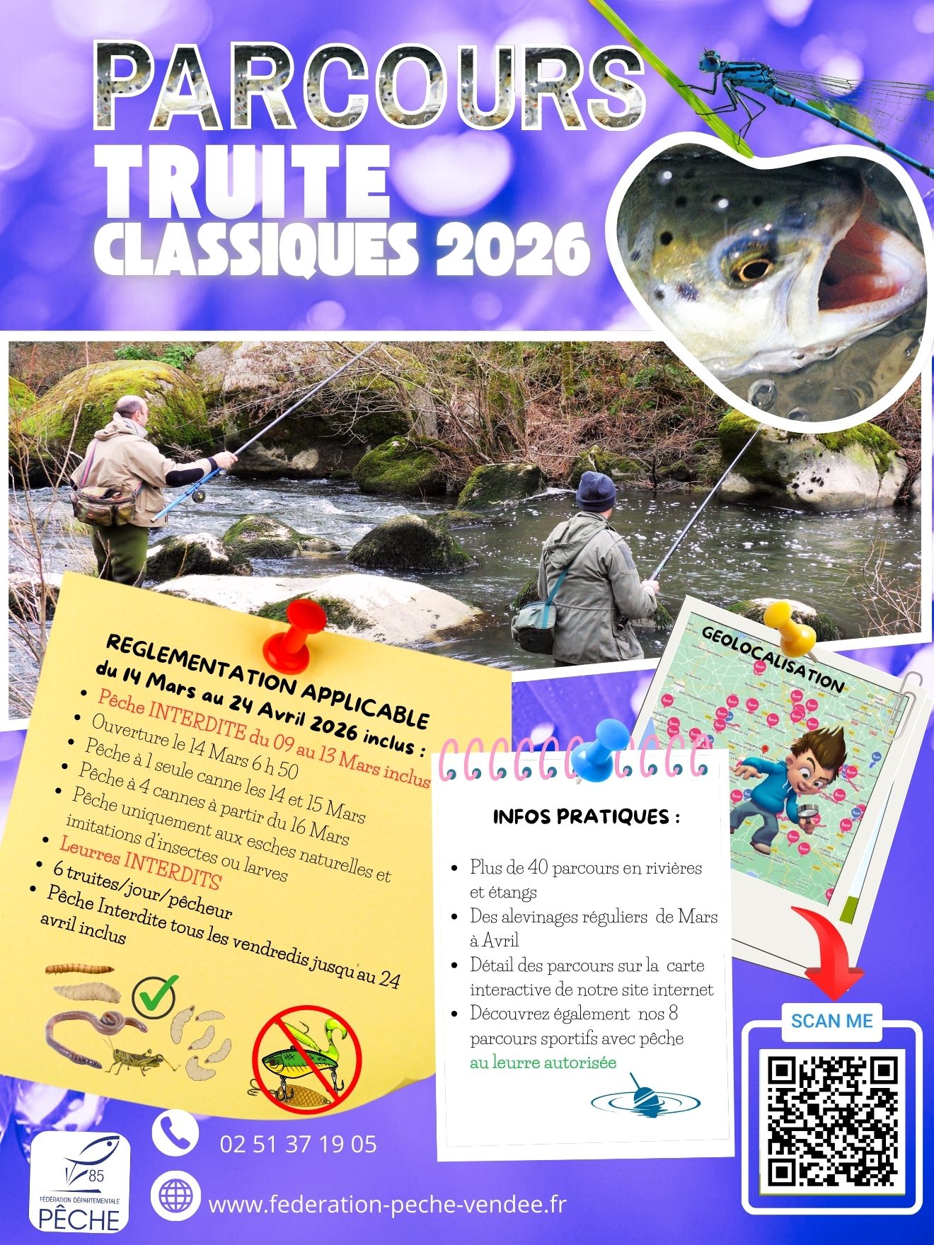 En Vendée tous nos cours d’eau sont classés en 2ième catégorie piscicole mais 26 AAPPMA du département introduisent de la truite sur une quarantaine de parcours en rivières et plans d’eau du pour l’ouverture de la pêche de la Truite