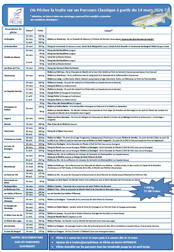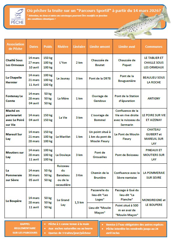 - Tous les parcours de pêche seront fermés du 09 au 13 Mars inclus pour permettre les alevinages